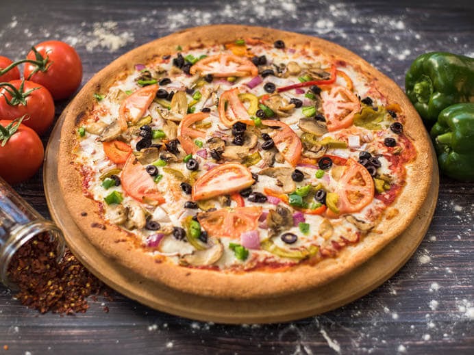 Thick, Pizza Sauce, Mozzarella, Black Olives, Onions, Mushrooms, Sweet Peppers, Green Peppers and Tomato.