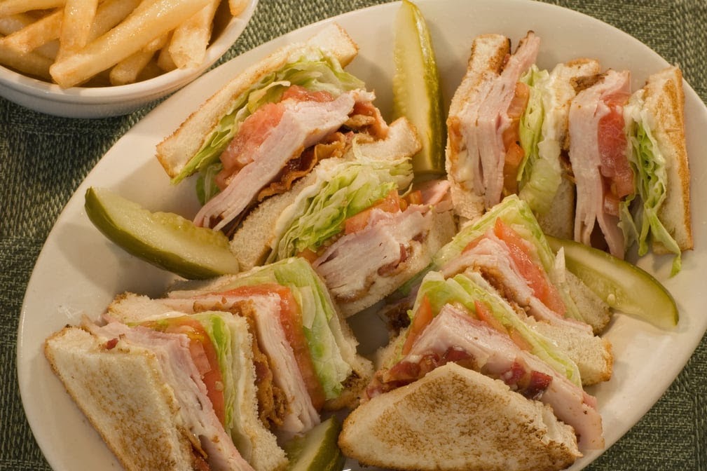 French Fries, White Bread, American, Mayo, Lettuce, Tomato, Turkey, Bacon and Toast the Bread.