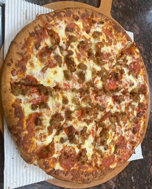 Thick, Pizza Sauce, Mozzarella, Pepperoni, Sausage, Meatball, Mushrooms, Sweet Peppers and Onions.