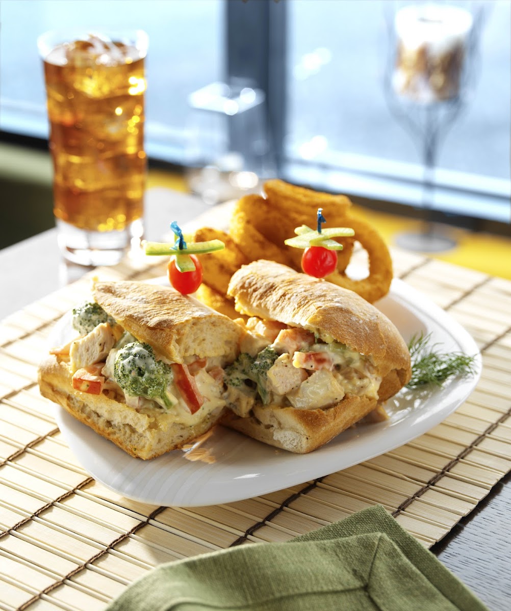 Honey Mustard, Lettuce, Tomato, Onions, Fries, grilled chicken, Bacon.